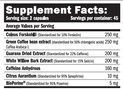 - 250 mg Coleus Forskohlii (10 % Forskolin) – stimuliert den Stoffwechsel